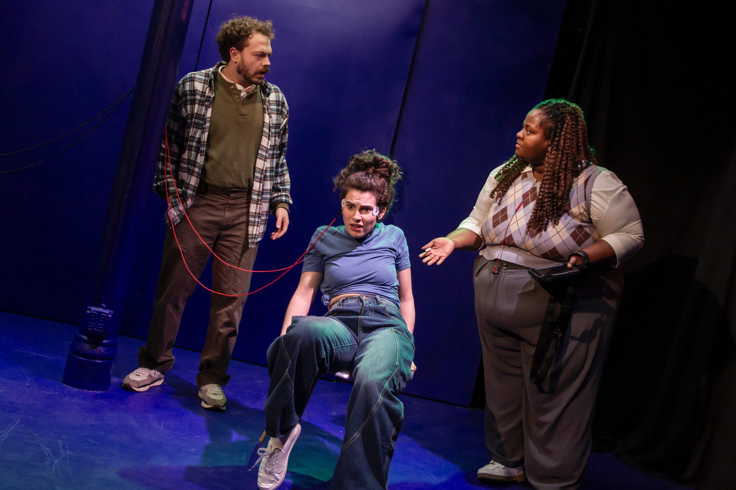 The performances, though admittedly based on a flawed script, do not improve the situation. To put the problem simply, the actors, like their characters, are stuck in a bad habit: They play each scene the same. When we meet Deckner-Glick’s Aimee, she is bitter and frustrated, and so she remains for the entire play. Bryce Lederer as Blair, a wannabe influencer, has a sort of stagnant Shaggy from Scooby-Doo nervous energy that only alters at the end of his arc.